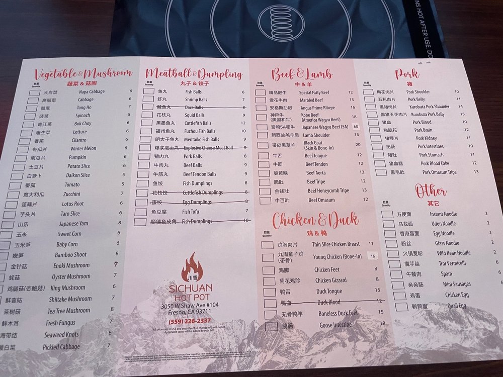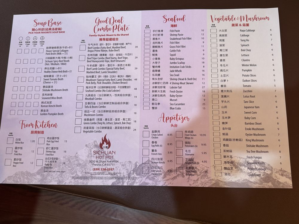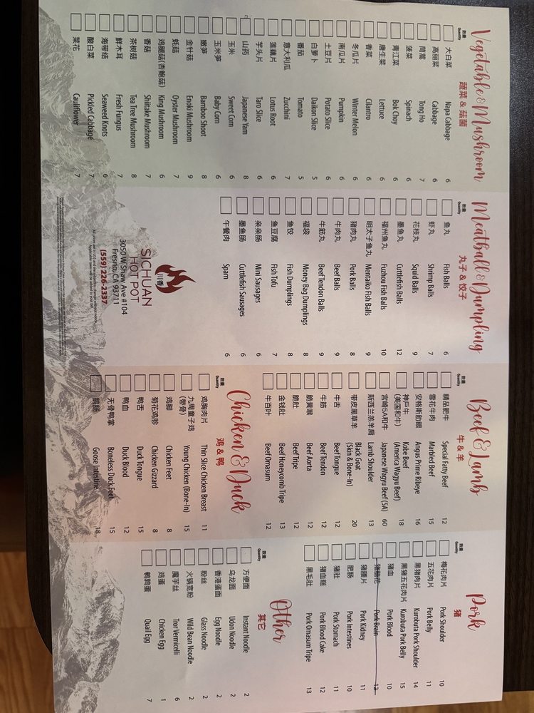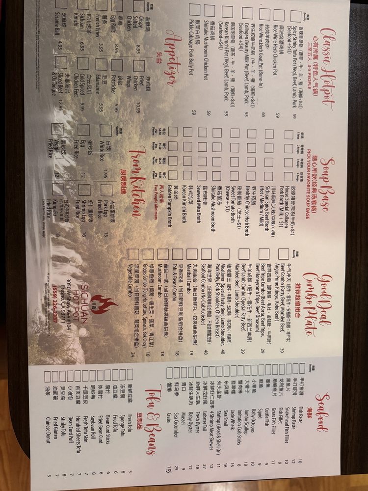 Introducing the menu at Sichuan Hot Pot located in Fresno, CA. This hot pot experience offers a variety of broths, from rich and spicy Sichuan peppercorn-infused broth to milder savory options. Customers can customize spice levels for a personalized dining experience. Top-notch fresh ingredients like thinly sliced meats, crisp vegetables, and flavorful dipping sauces elevate the meal. The staff provides friendly and knowledgeable service, enhancing the overall experience. Standout dishes include the House Special Collagen Broth, Sweet Tomato Broth, Meat Combo Plates, Mushroom Combo Plate, and the Egg Fried Rice. The cozy ambiance, efficient service, and quality ingredients make Sichuan Hot Pot a must-visit hotspot for hot pot enthusiasts.
